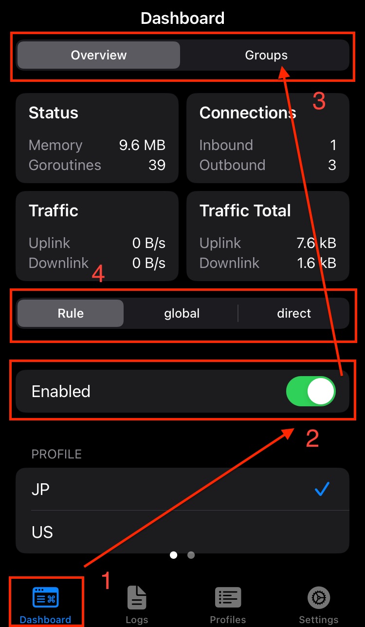 如果没有什么意外其实这个时候你的网络就已经可以用了。如果你不想浪费时间,那么在这里就可以关闭教程了,不过如果你不是那么急的话,建议看完,或者以后遇到问题了再回来看。 先说一下图中标记了4的地方,这里有3个按钮,Rule,global,direct,在99%的情况下我们选择Rule即可,在一些极端或测试的情况下你可以试试global,就是全局的意思,在任何时候都不选择direct。 我们点击图中第三步箭头处的Groups,进入到下一个环节——线路选择。